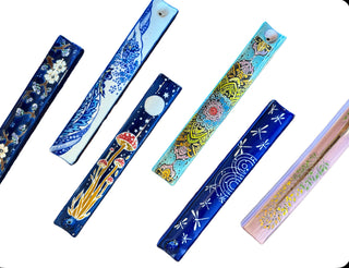 This elegant collection of handpainted ceramic incense holders offers a harmonious blend of functionality and artistry. Each is thoughtfully designed to ensure clean ash collection while doubling as a decorative piece to elevate any space.