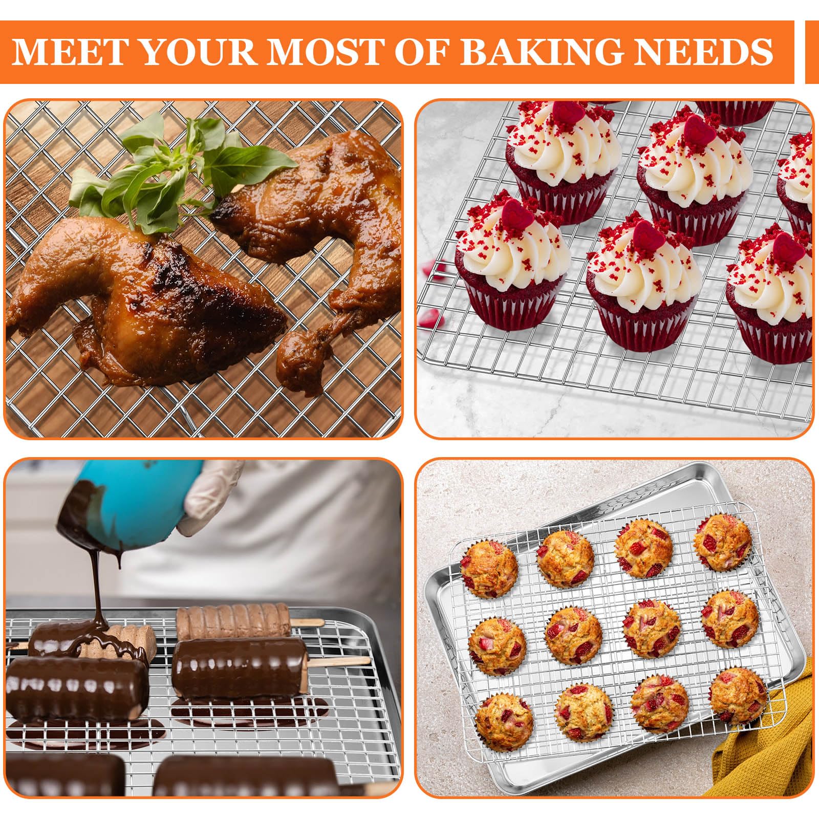 • Dense Mesh Cooling Racks, the wire racks for baking are each only 3/8" in size, with a tightly connected structure that prevents food from falling and ensures rapid cooling of food, stainless steel baking racks are easy to wipe off food and do not break easily, dishwasher safe