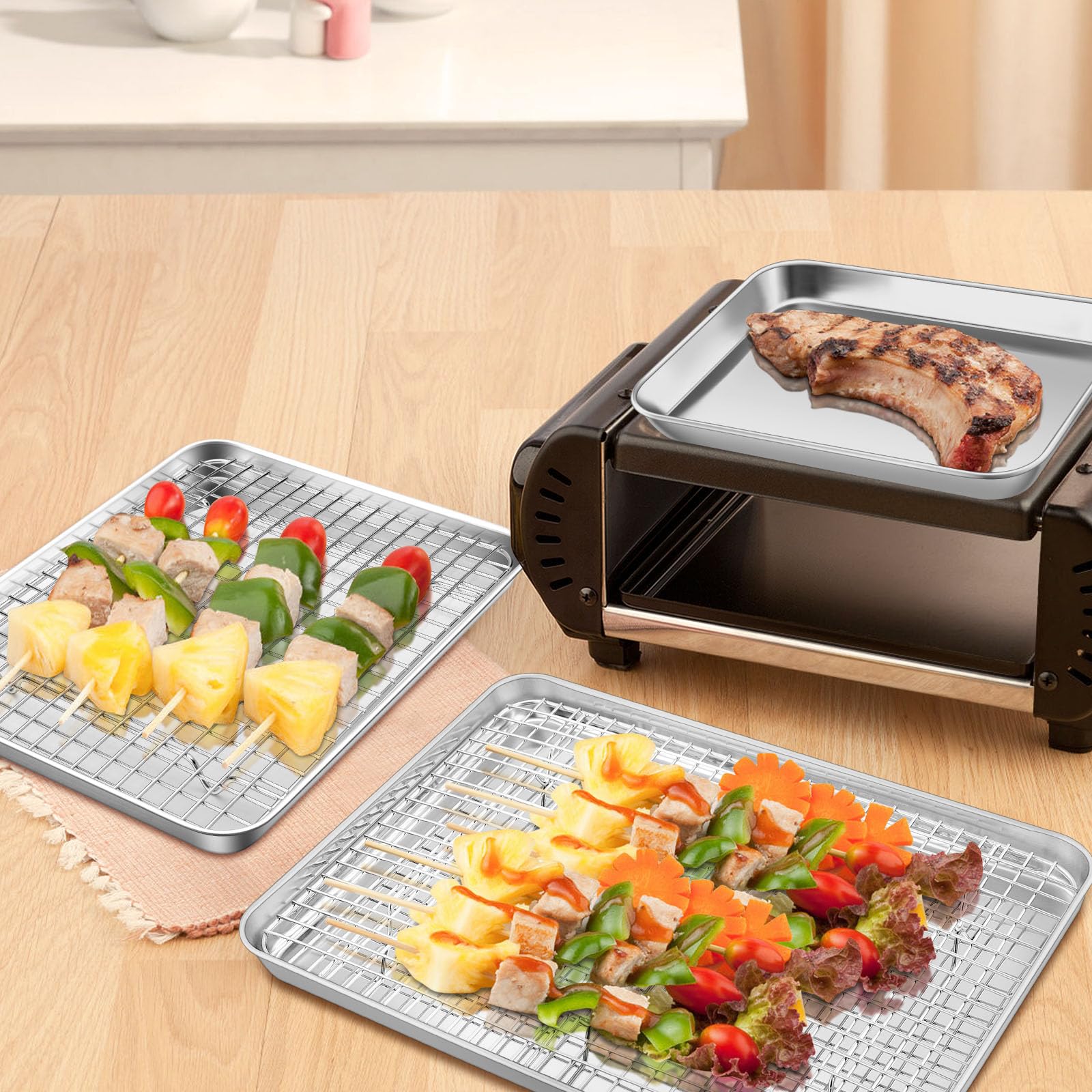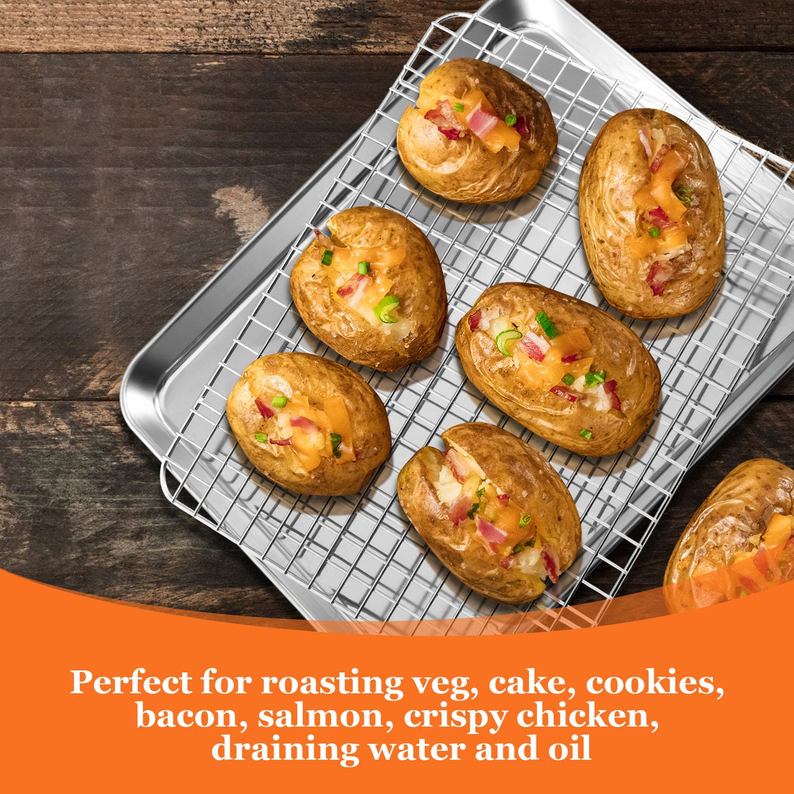 • BAKING MUST HAVE: these baking pans and racks can be used individually, the baking sheet make grilled chicken wings, beef ribs, vegetables, and the cooling racks can strain grease, water, cool, bake cookies and bacon