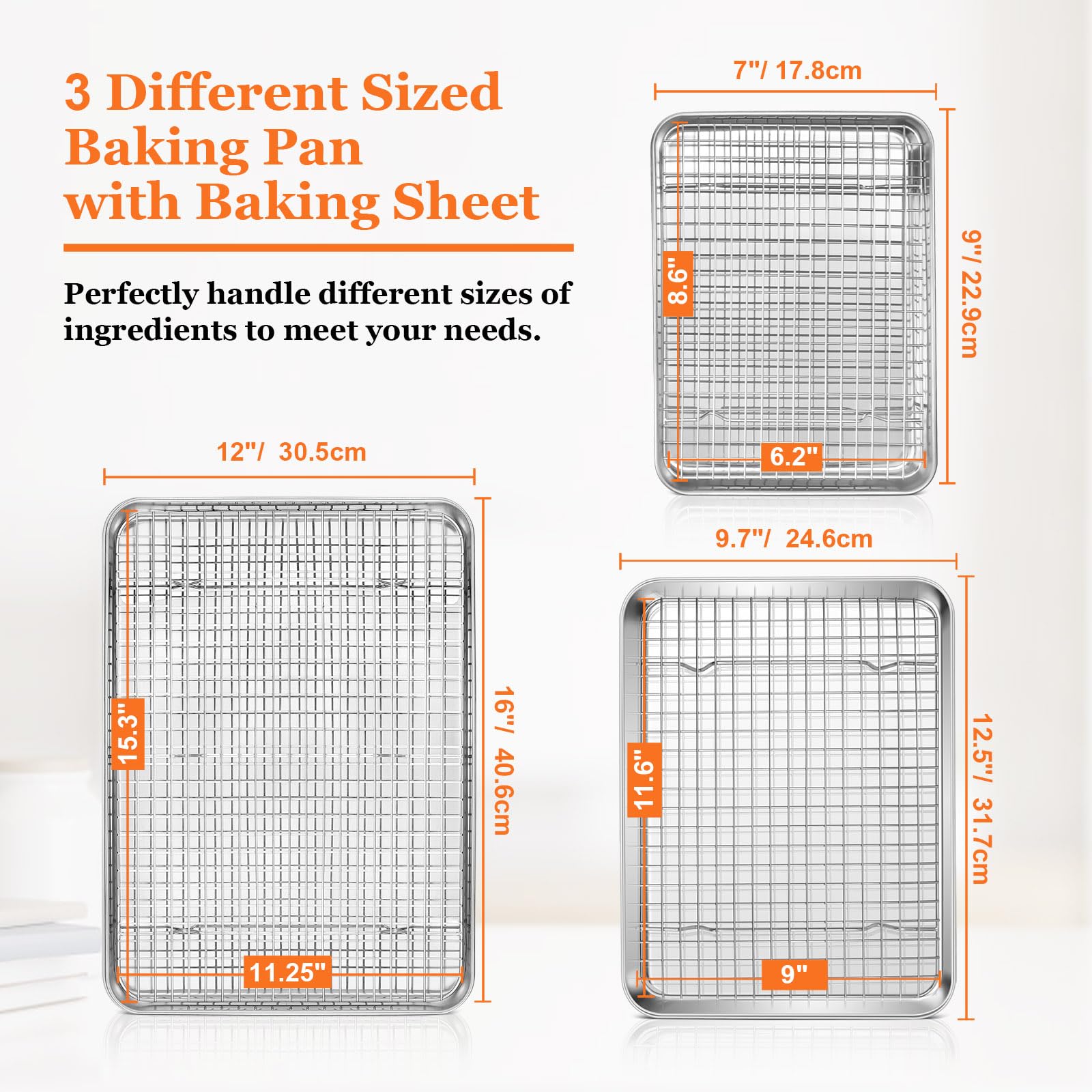 • Package Included, you will receive 3 different sizes of baking pans and cooling racks, small 9 x 7 inches, medium 12.5 x 9.7 inch, and large 16 x 12 inches, is suitable for kitchen baking, parties, commercial restaurants, pastry stores, and for making desserts and roasts in various sizes