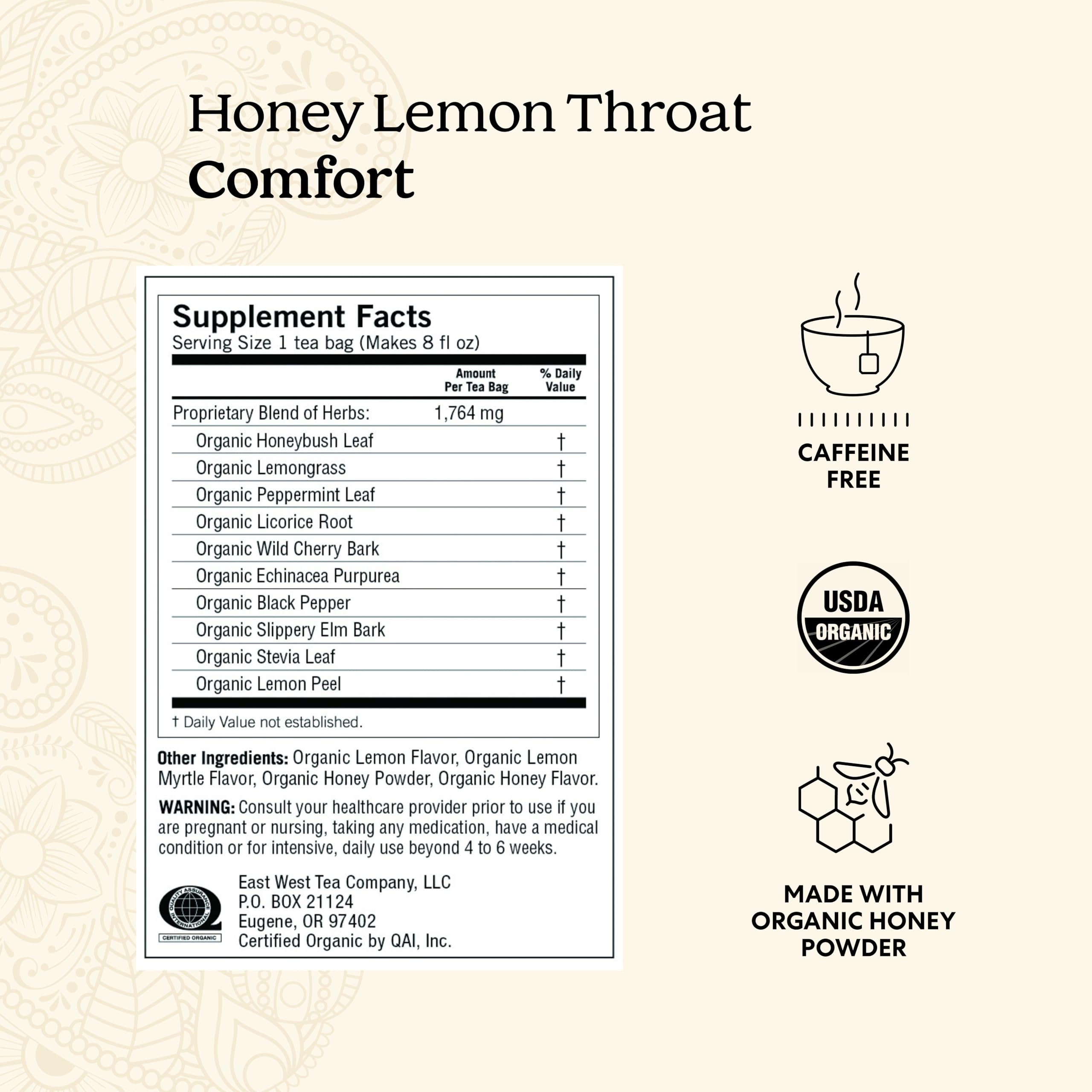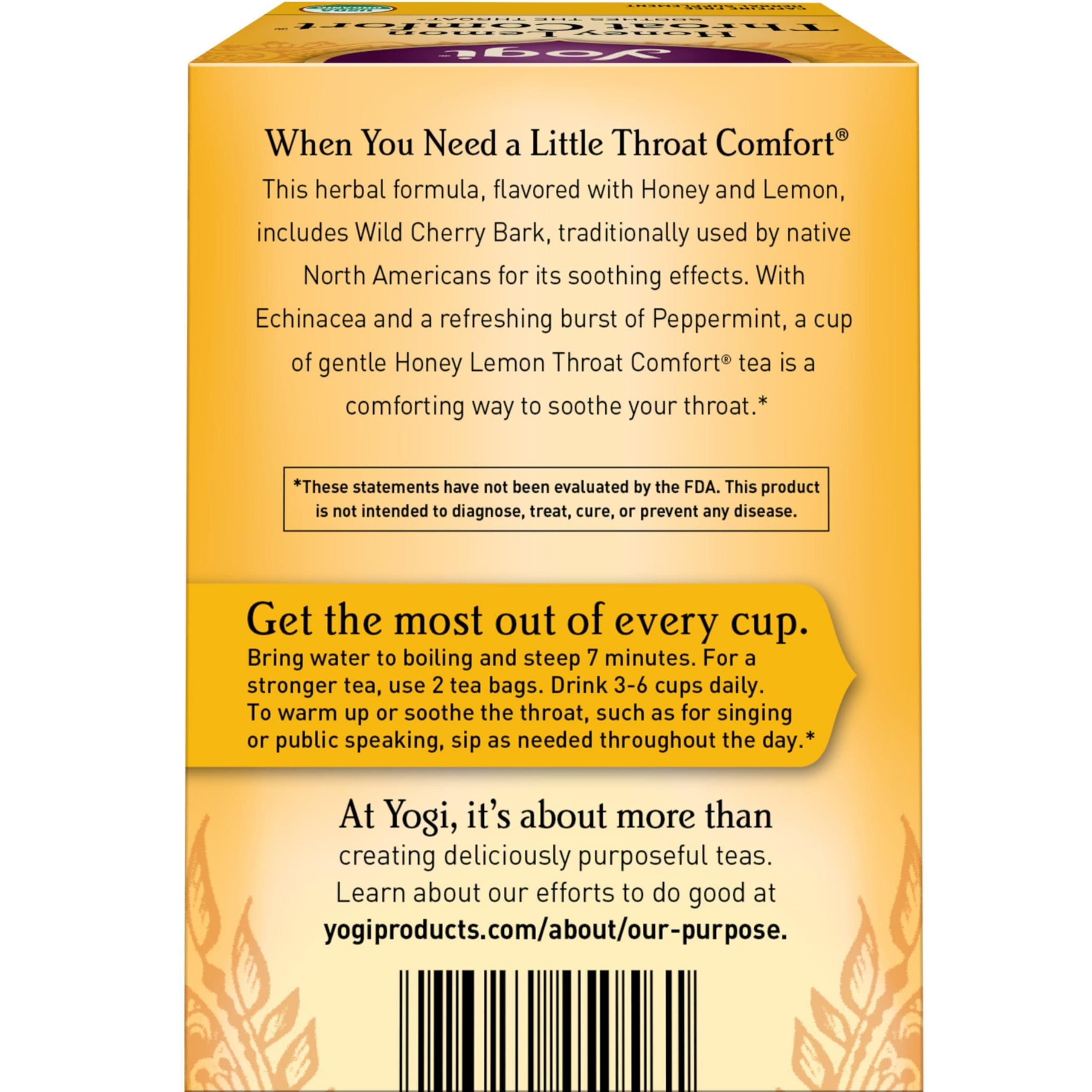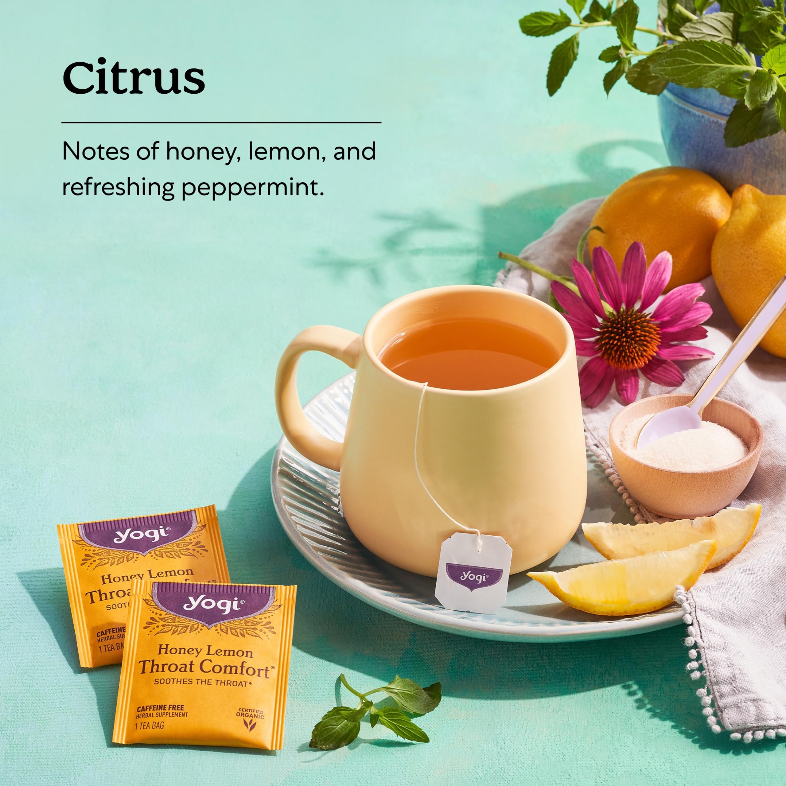 • Lemon & Honey Tea: Yogi Honey Lemon Throat Comfort tea is purposefully blended with Echinacea Purpurea and Wild Cherry Bark, ingredients traditionally used for their comforting properties